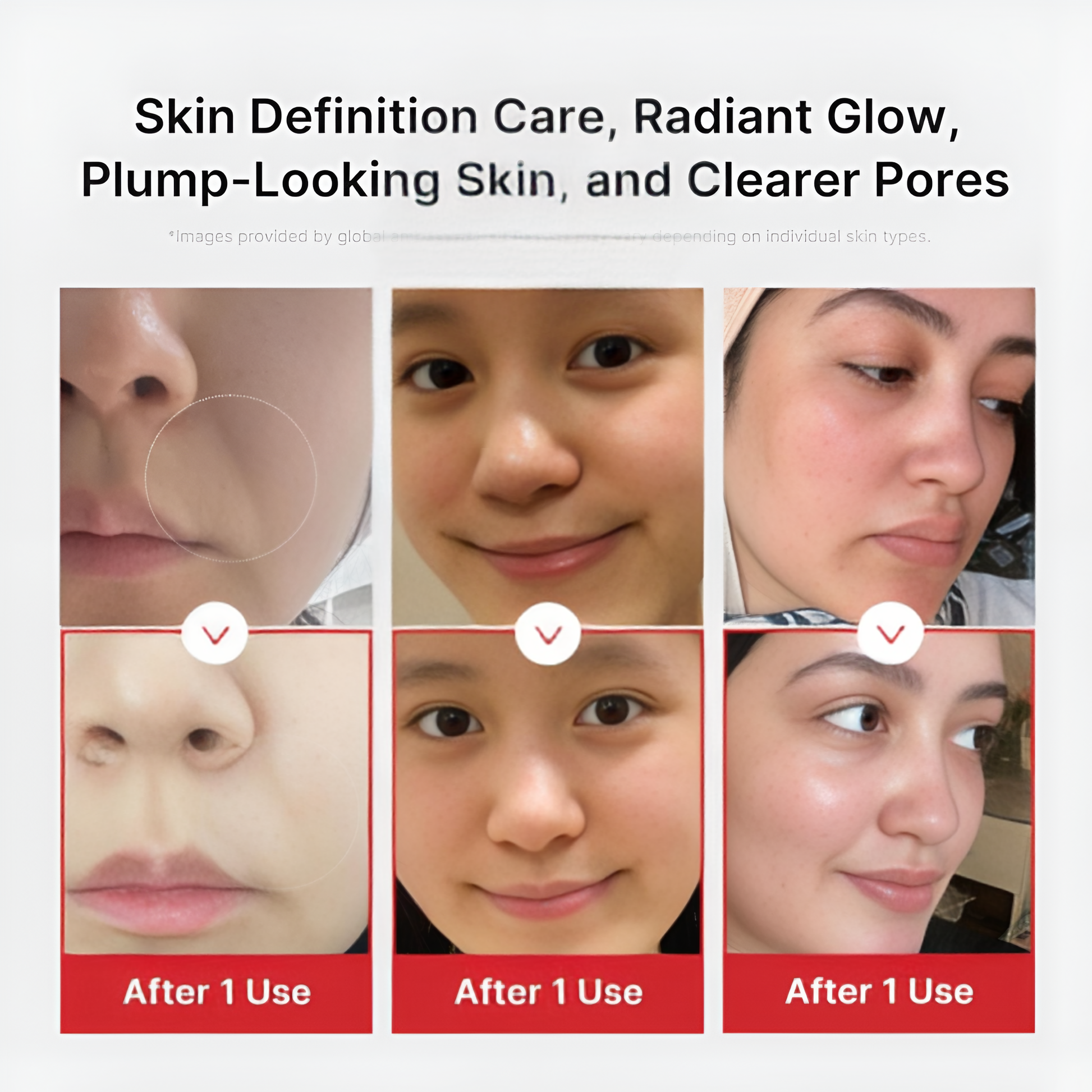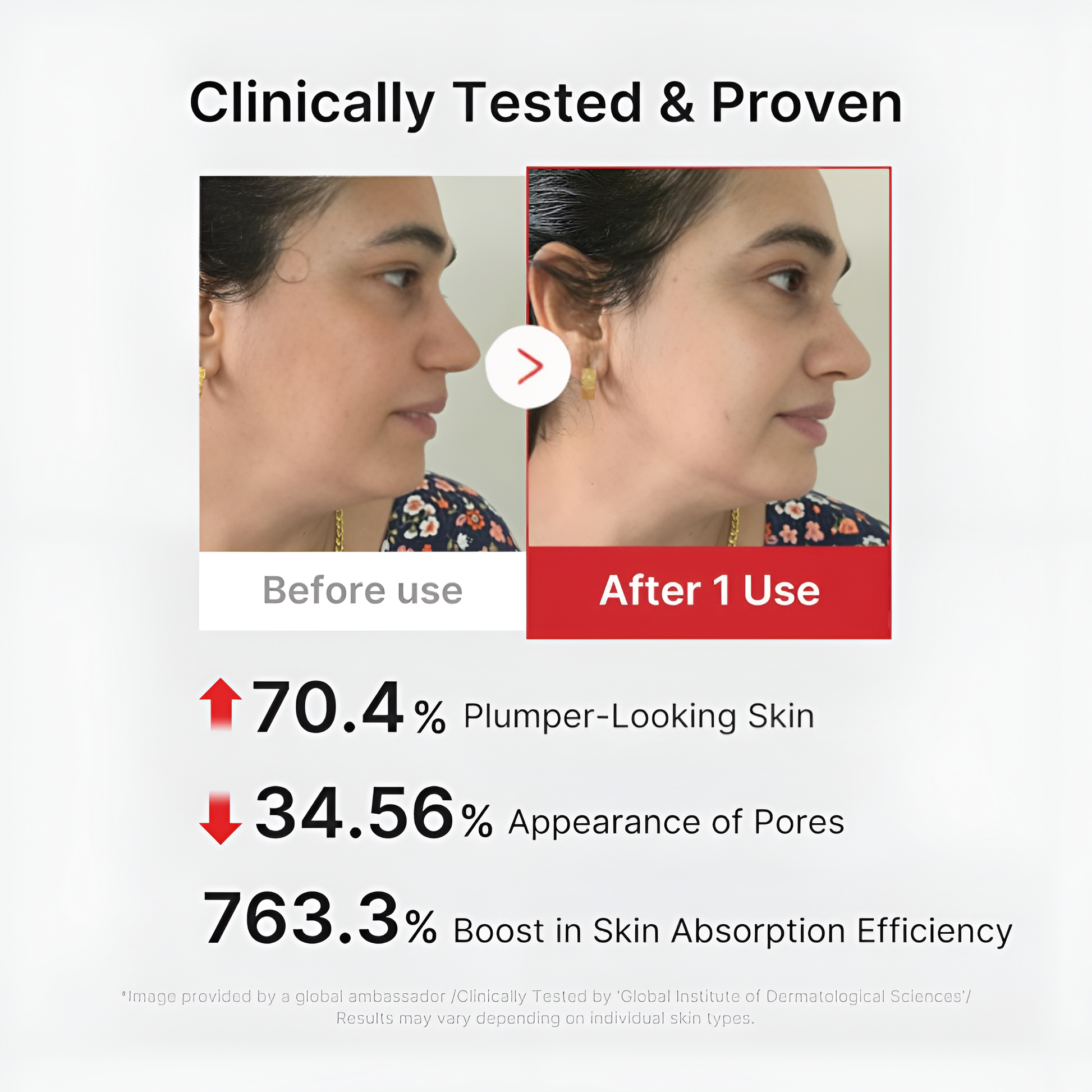 Most users see an immediate glow and lifted appearance after the first use. Clinical studies show significant improvements within 2 weeks: 34.5% reduction in pore visibility, 35.9% improvement in facial volume, and 11.4% boost in skin radiance. Consistency is key – just 5 minutes daily delivers best results.