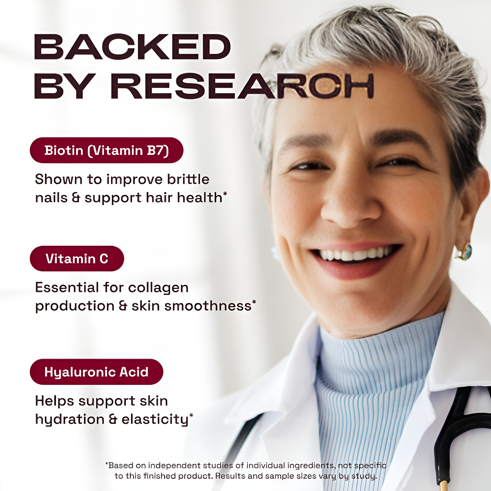 CA AKG → MSM → Hyaluronic Acid → Biotin. Every ingredient works together for real results.